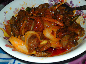 Kebetulan ada sedikit daging yang telah siap direbus dalam peti ais. Saya masak lauk kegemaran keluarga iaitu daging merah.. Daging merah ni sangat popular kat kedai2 tomyam atau restoran yang menyediakan masakan panas. Biasanya lauk ni berwarna merah dan ada campuran kacang panjang atau bunga kubis. Tapi saya stok sayur-sayuran tu.. jd masak yang ringkas2 je.. janji ada rasa.. takpelah menderhaka sikit pada resipi asalnya. Cuma hiriskan daging yang telah siap direbus, gaulkan dengan sos tiram, sos nampla, sos cili dan sos tomato. Perap sekejap. Kemudian tumiskan halia, cili padi dan bawang putih yang diketuk hingga kekuningan dan naik bau. Masukan daging yang diperap dan kacau. Tambahkan sedikit air rebusan daging dan masak sampai pekat. Akhir sekali, campurkan hirisan bawang besar dan cili merah. Siap untuk disajikan.